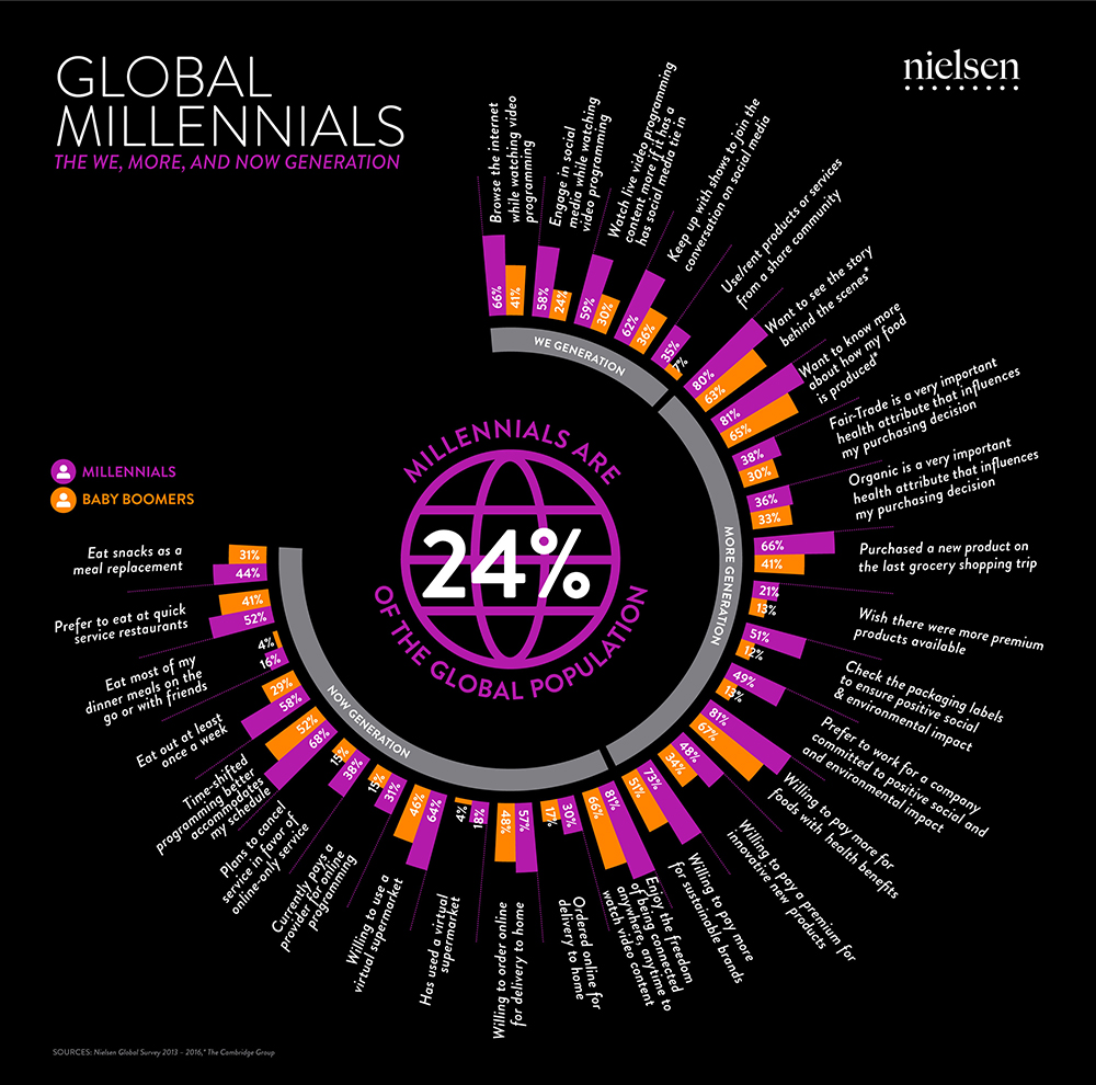 Nice comparison chart from Nielsen - Core values and characteristics Millennials vs. Boomers - how they think, spend and act. #Millennials = the we, more and now generation